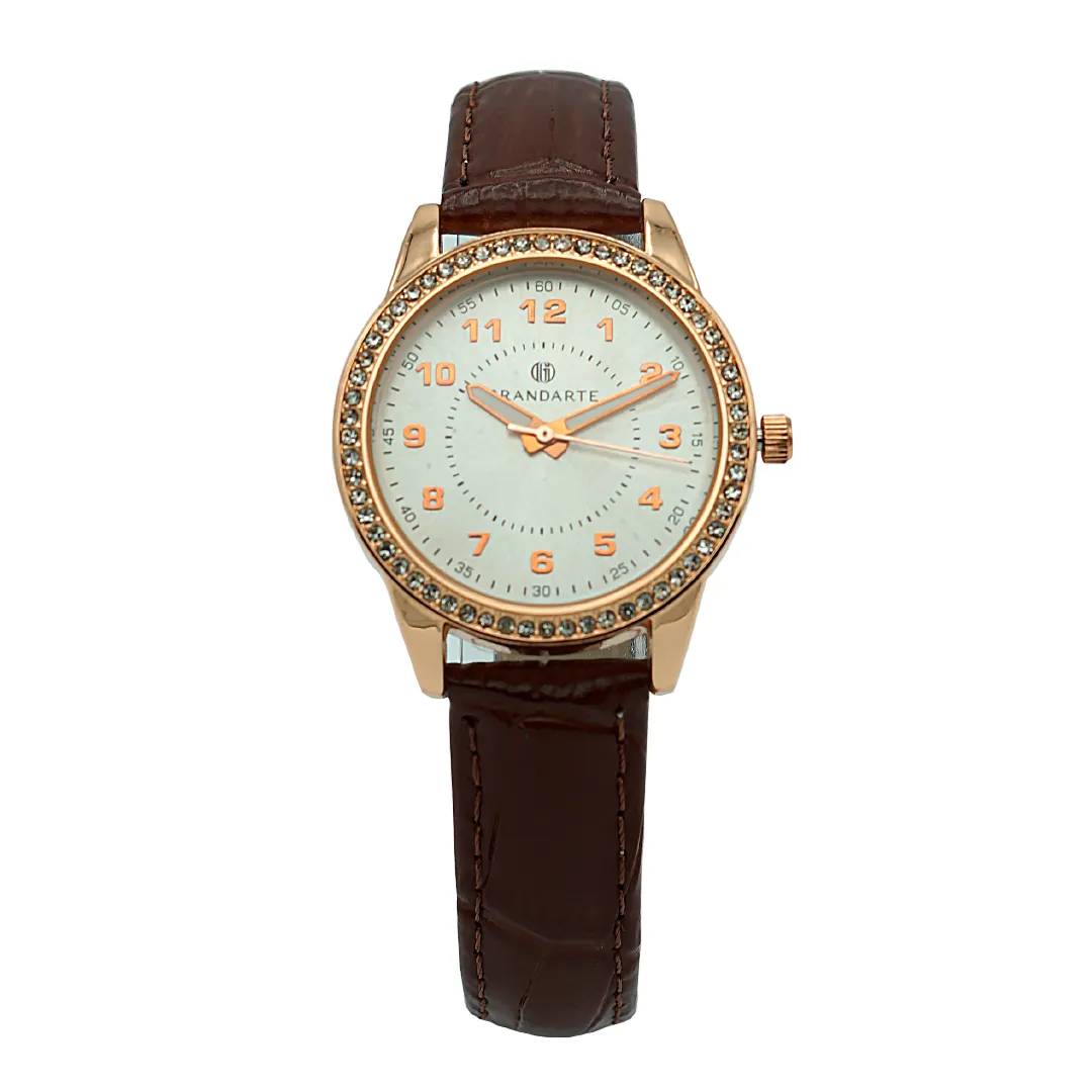 Relógio Grandarte Classic Earth com pulseira em couro sintético 34 mm de diâmetro. A caixa é de metal rosé com mostrador prateado, vidro com mineral endurecido.