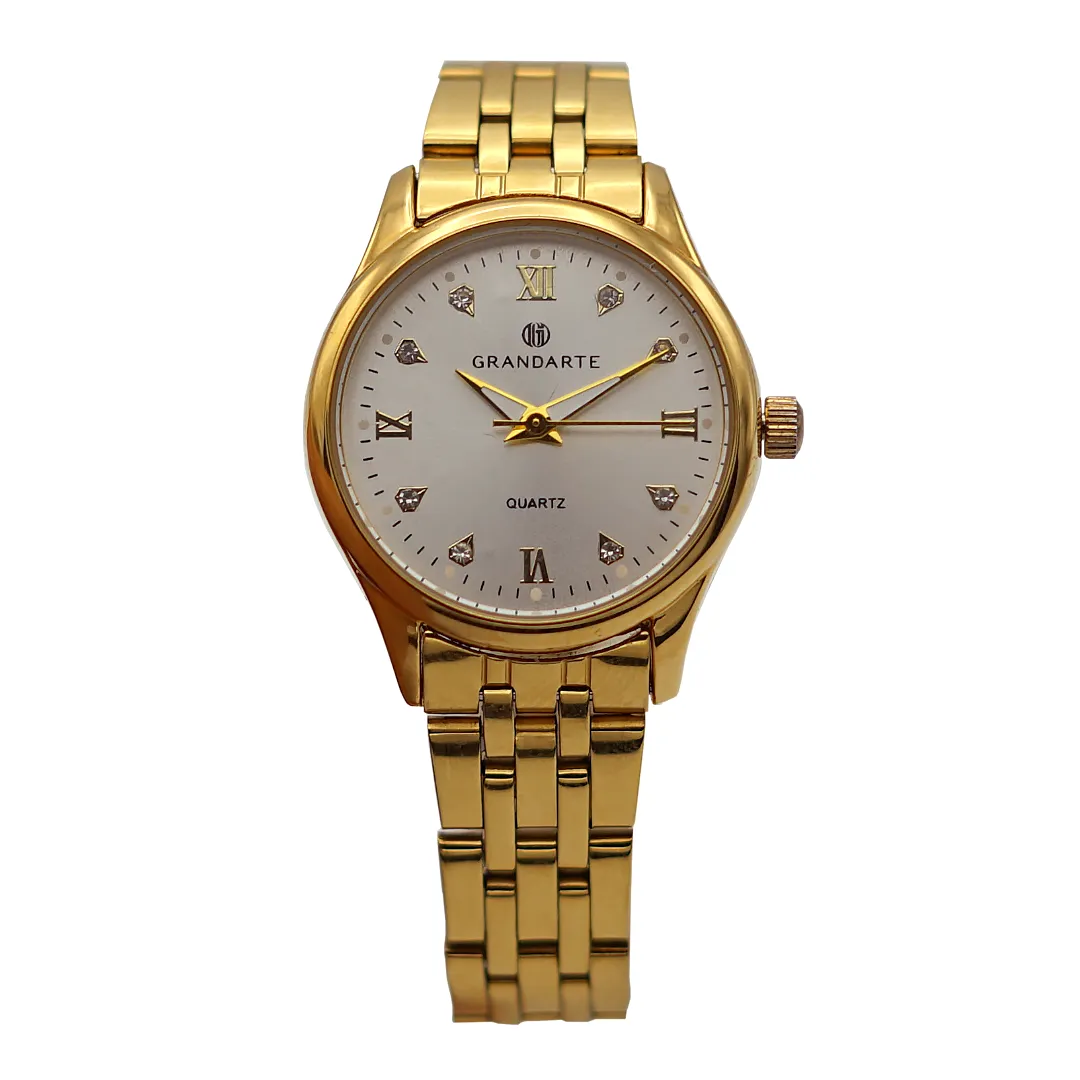 Relógio Grandarte com pulseira em aço inoxidável cor dourada 28 mm. A caixa é de metal dourado com mostrador branco.