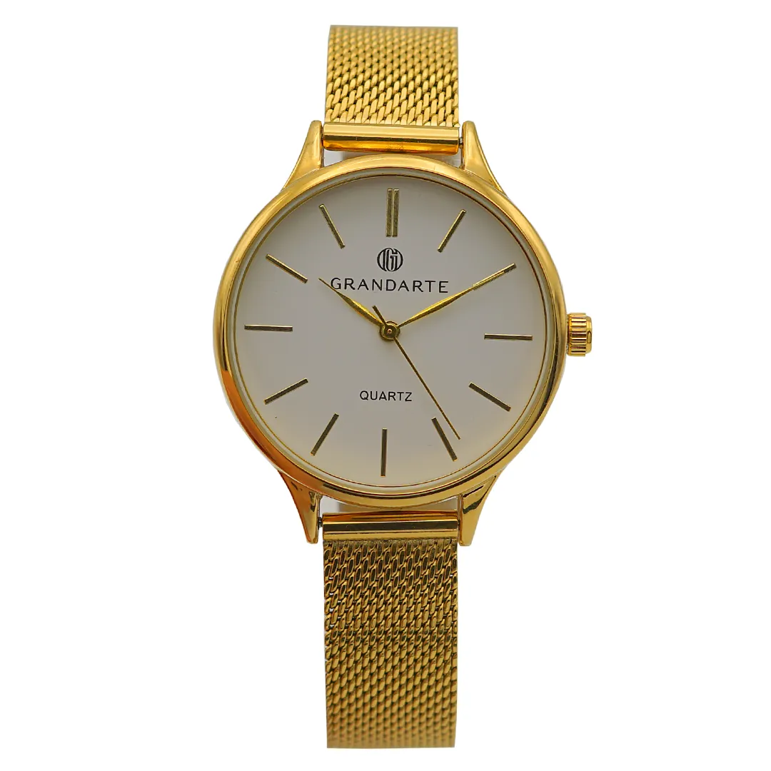 Relógio feminino Grandarte com pulseira de aço inoxidável cor dourada 36 mm. A caixa de metal também dourada com mostrador branco.