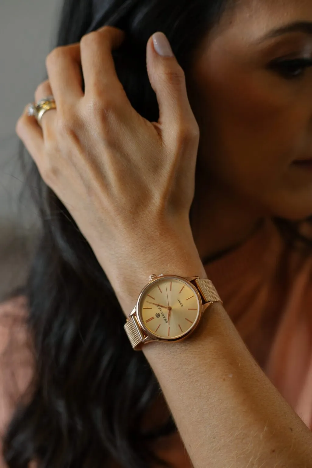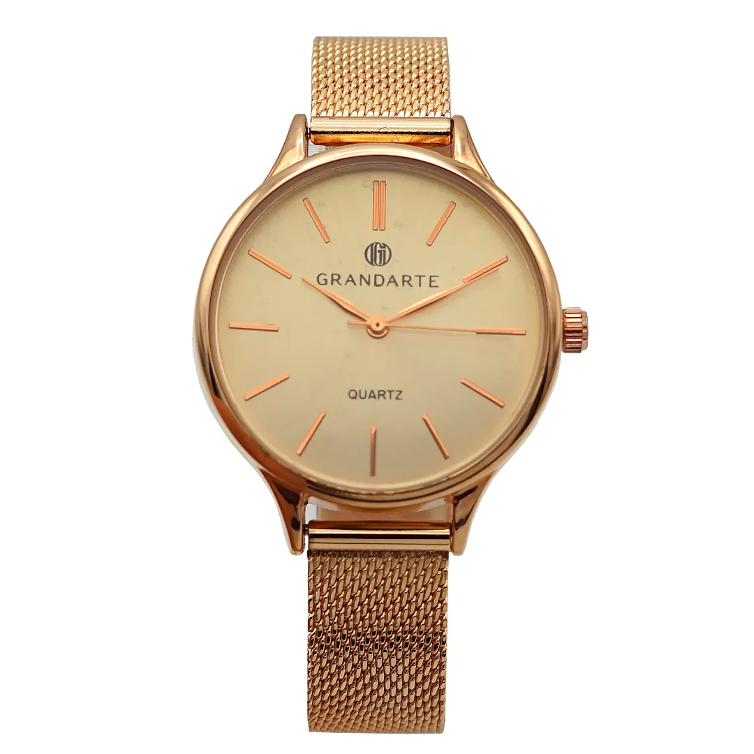 Relógio feminino Grandarte  com pulseira de aço inoxidável cor rosé 36 mm. A caixa é de metal com mostrador rosé metalizado.